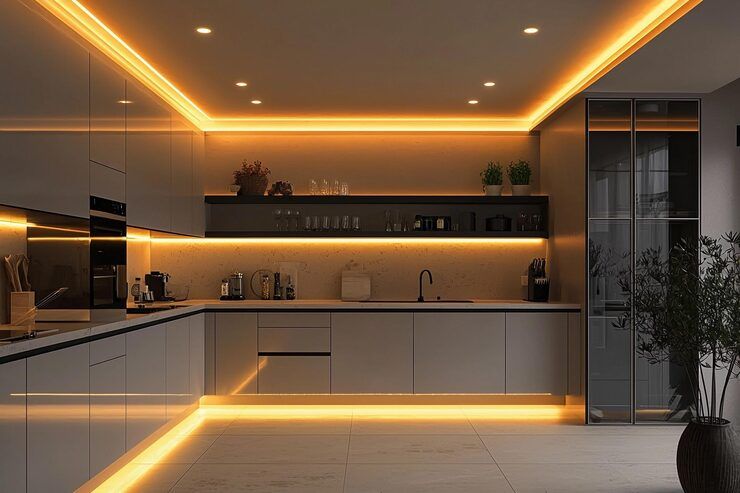 Accent lighting adds style and highlights certain features. It can be used to showcase cabinets, shelves, or decorative elements.